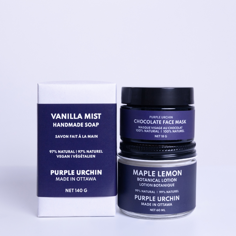 The Chocolate Face Mask can be mixed with a liquid base of your choice to accommodate a diverse range of skin care needs (see product page for all recipes). The Vanilla Mist Bar bar soap provides sweet suds, keeping you clean while also quenching your skin effortlessly, and can be used as a body bar and/or a hand washing bar. The Maple Lemon Botanical Lotion is a luxurious moisturizer that penetrates into the skin's surface without leaving a greasy feel.